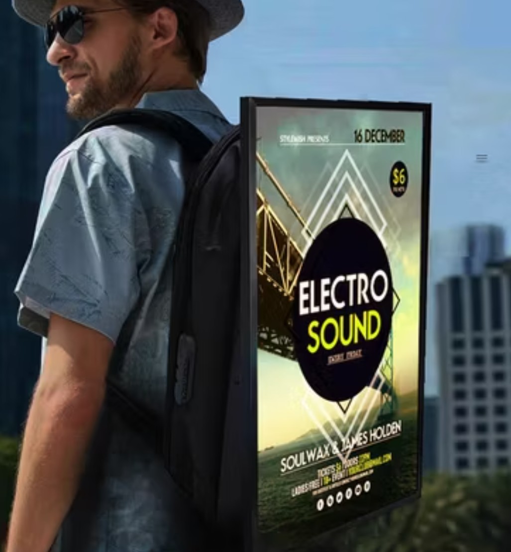 A mobile advertising platform where trained promoters wear digital screens that display your campaigns while moving through busy public areas.